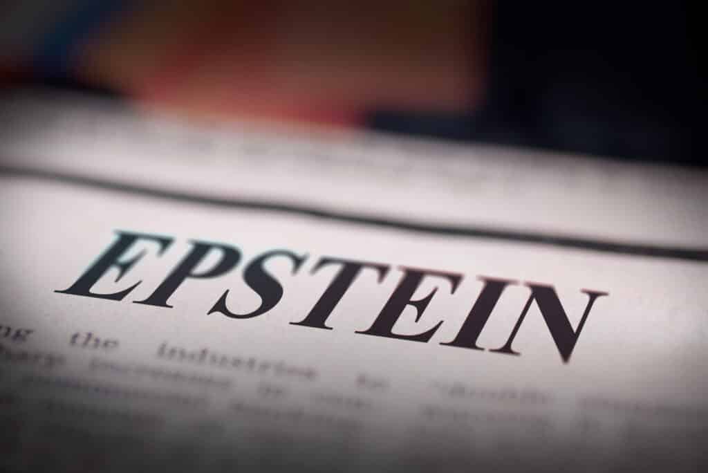 A shallow depth of field close up photograph focusing on the word "Epstein" in a newspaper headline.