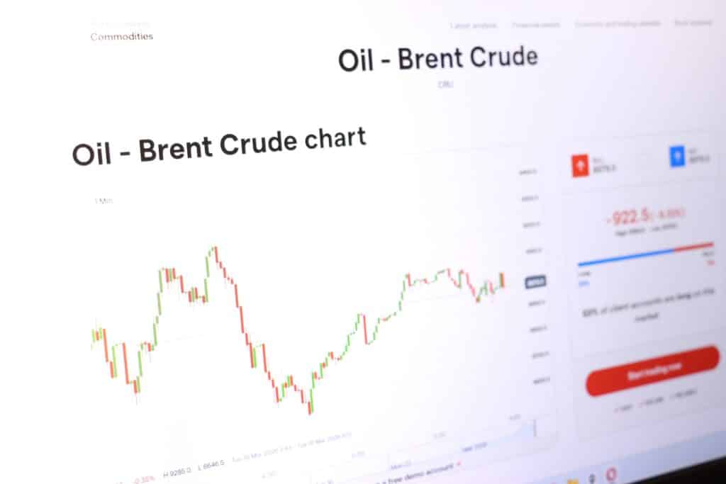 Brent crude oil price chart displayed on computer monitor. Financial market analysis and commodity trading data. Economic dashboard showing petroleum price trend for investment strategy.