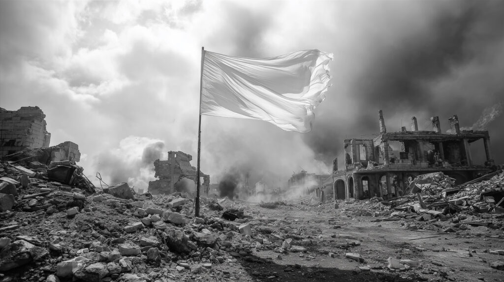 A grayscale image portrays a desolate landscape riddled with rubble and ruins, suggesting a scene of devastation and conflict. A white flag billows in the overcast sky, implying a potential ceasefire or surrender. The image is composed in a dramatic style with dark tones and hints of smoke, suggesting a harsh environment.