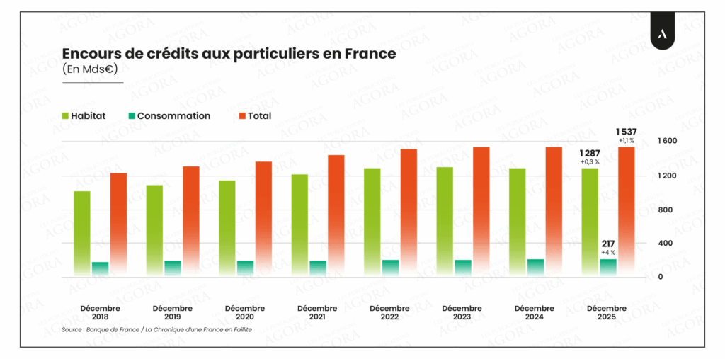 Depuis 2018, les encours cumulés des prêts à la consommation et des prêts immobiliers sont passés de 1 200 milliards à 1 537 milliards d’euros, soit une augmentation de 28 %.