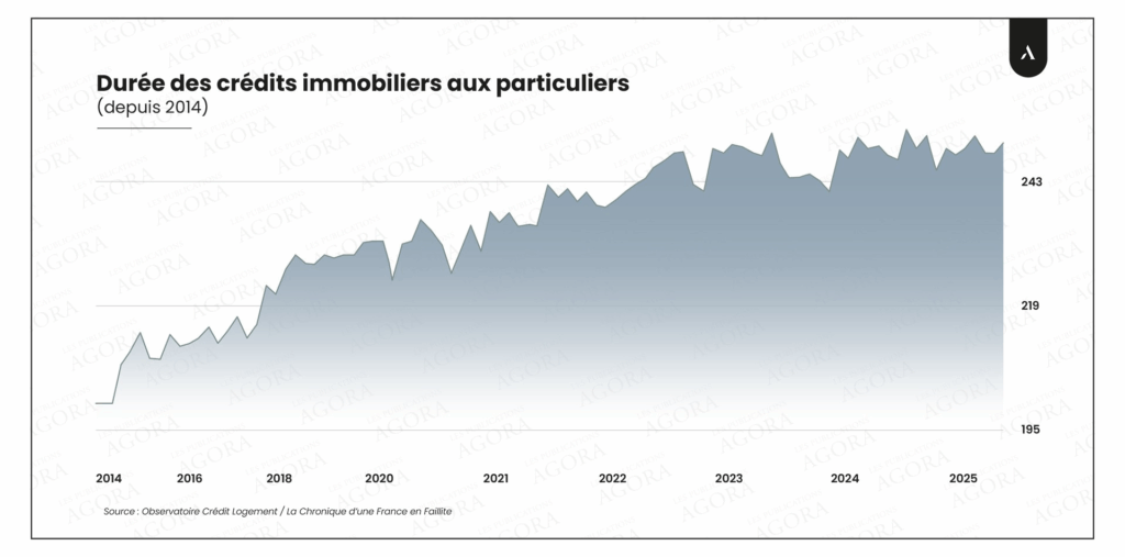 La durée des prêts immobiliers suit la même logique. La durée moyenne est passée de 197 mois en 2014 à plus de 243 mois aujourd’hui. Chaque remboursement immobilise des revenus qui ne peuvent plus circuler dans l’économie.