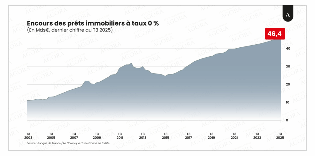Les encours du PTZ sont passés de 40 milliards en 2020 à 46,4 milliards au troisième trimestre 2025. Petite confidence : contrairement à ce que beaucoup peuvent penser, ce n’est pas l’État qui prête directement aux particuliers. La banque octroie le prêt à son client au taux qu’elle souhaite, et c’est l’État qui prend en charge le paiement des intérêts.