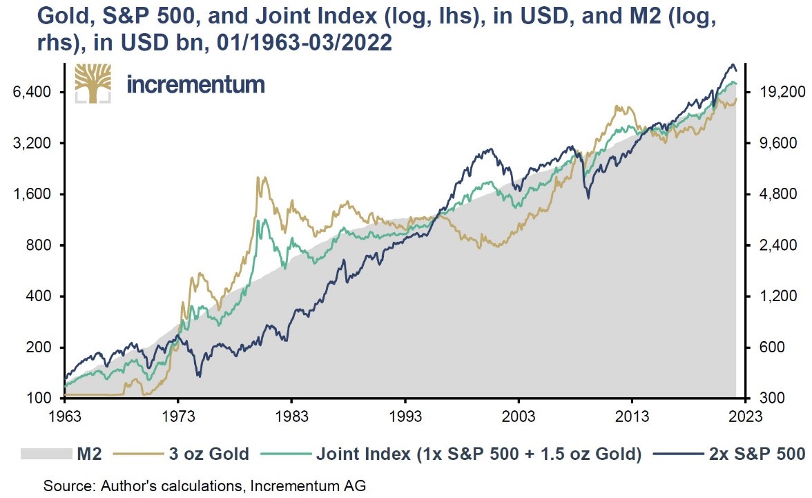 Dans mon billet de 2023, je vous avais en effet rapporté que selon Knoll, « les tendances des cours des actions américaines et de l’or au cours des 50 dernières années peuvent être attribuées à seulement deux facteurs : l’évolution de la masse monétaire, qui agit comme le principal moteur, et la confiance des investisseurs, qui sert de mécanisme de contrôle pour la répartition de la valeur entre ces deux actifs« .