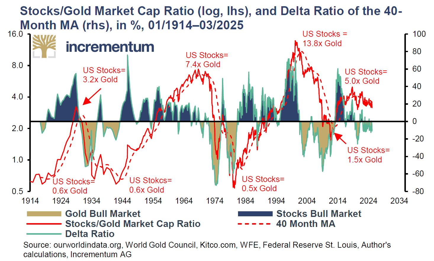 Ratio capitalisation boursière des actions/capitalisation boursière de l’or (log, échelle de gauche) et ratio delta de la moyenne mobile sur 40 mois (échelle de droite) (%, 01/1914–03/2025)
