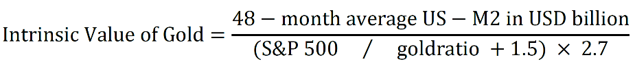 Valeur intrinsèque de l’or = 48 − moyenne mensuelle de la masse monétaire américaine M2 en milliards de dollars / (ratio S&P 500⁄or + 1,5) × 2,7