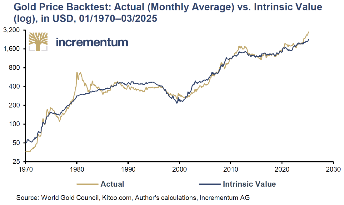 Test rétrospectif du cours de l’or : valeur effective (moyenne mensuelle) vs. valeur intrinsèque (échelle logarithmique, $, 01/1970–03/2025)