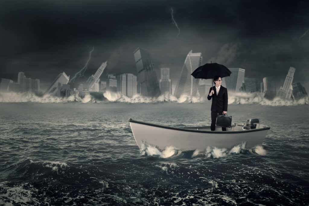 Young businessman standing on the boat while holding an umbrella and briefcase with a sinking town at the sea