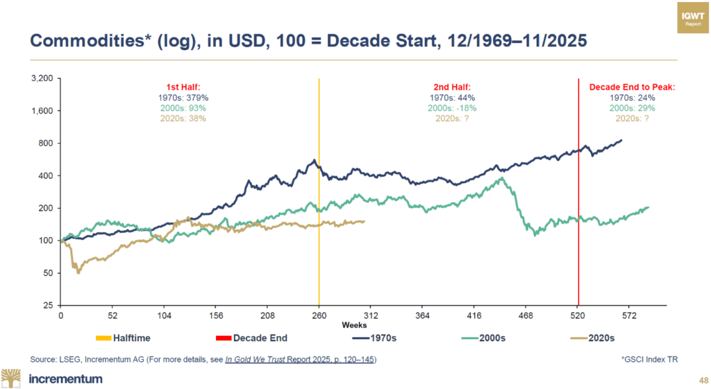 Matières premières (base 100 = début de la décennie, échelle logarithmique, 12/1969 – 11/2025)