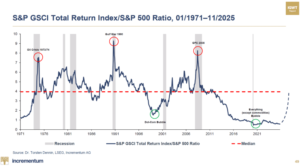 A fin novembre 2025, le niveau de ce ratio restait historiquement bas. Autrement dit : les matières premières restent extrêmement sous-évaluées par rapport aux actions. La période actuelle peut donc continuer d’être affublée du sobriquet « Everything (except commodities) bubble », c’est-à-dire la « bulle de tout (sauf des matières premières) » !