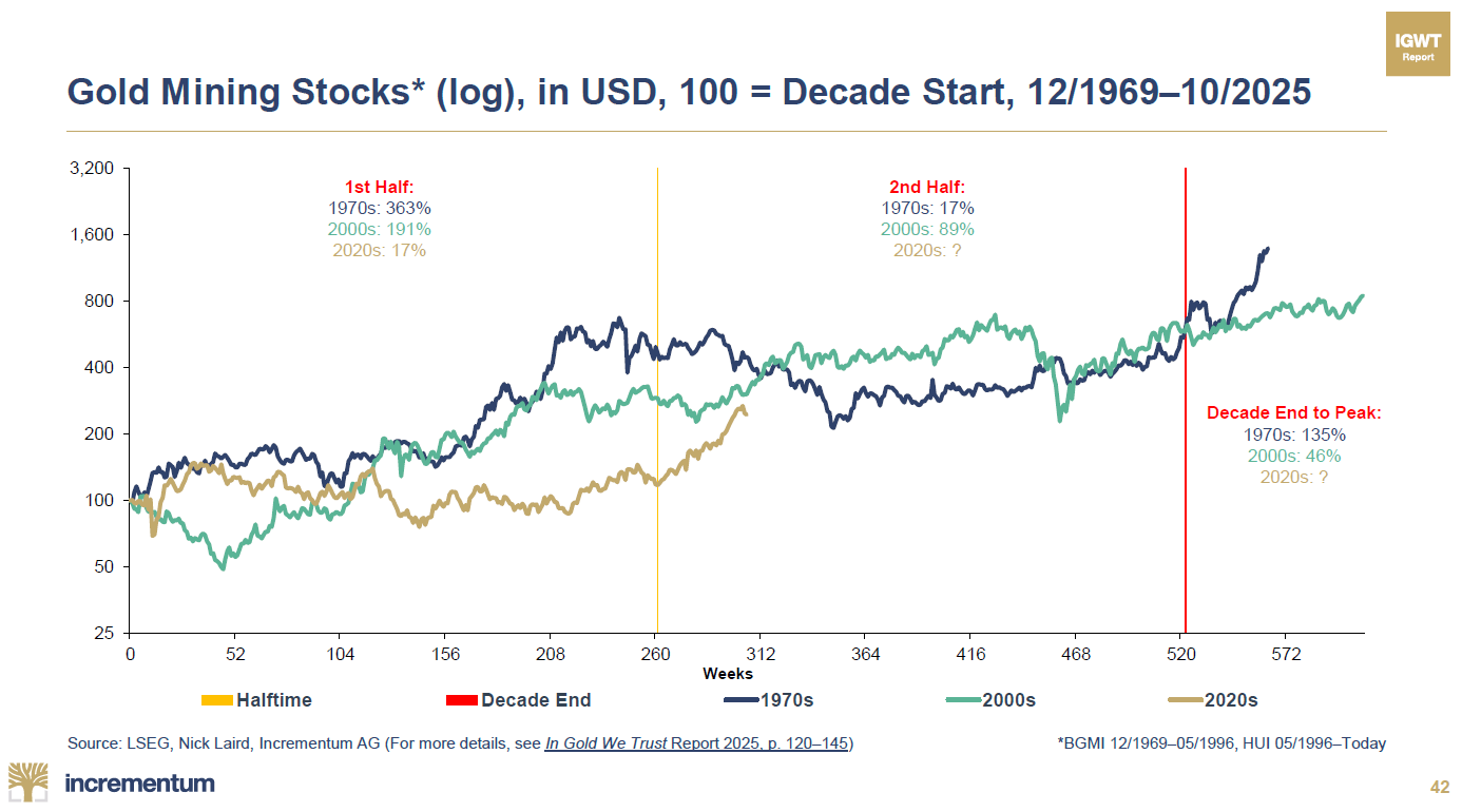 [Enfin,] La phase finale après la fin officielle de la décennie est particulièrement frappante. Dans les années 1970, les prix des actions ont explosé de +135 % supplémentaires. Dans les années 2000, ils ont augmenté de +46 %. Cela démontre une fois de plus que les actions des sociétés minières aurifères, traditionnellement considérées comme un levier cyclique pour le cours de l’or, réagissent souvent avec un décalage, mais de manière disproportionnée par la suite. »