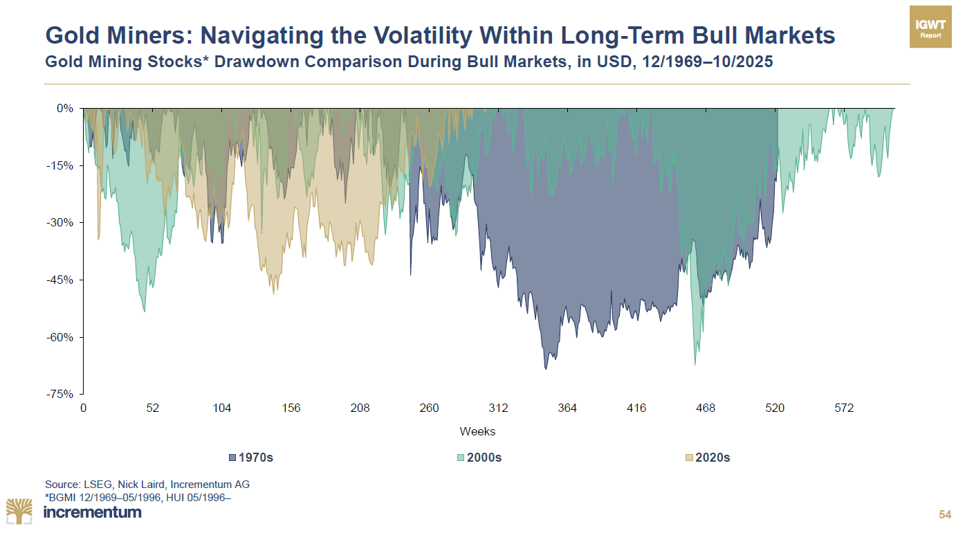 Corrections des minières durant les marchés haussiers de l’or (12/1969 – 10/2025)
