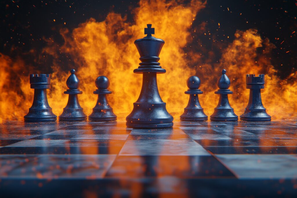 Chess figures intertwined with financial graphs against a digital backdrop