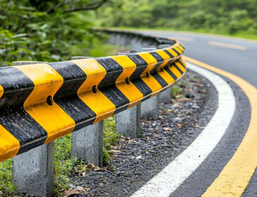 A winding road features a striking yellow and black safety barrier, providing protection for drivers. The lush greenery surrounding the road enhances the scenic view, making it ideal for travel and adventure imagery